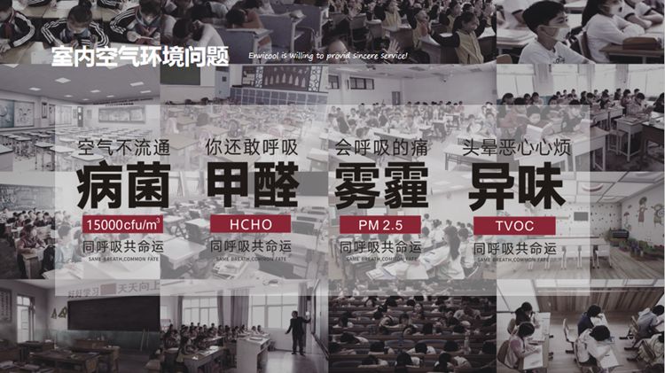 房总指出,目前教室空气环境面临着诸多问题:传统空调运行环境封闭,空气不流通造成二氧化碳、甲醛、TVOC等浓度偏高;人员密集,学校流感病毒传播迅速、造成交叉感染;北方雾霾污染……室内空气质量下降,直接降低学生学习效率,危害身体健康。