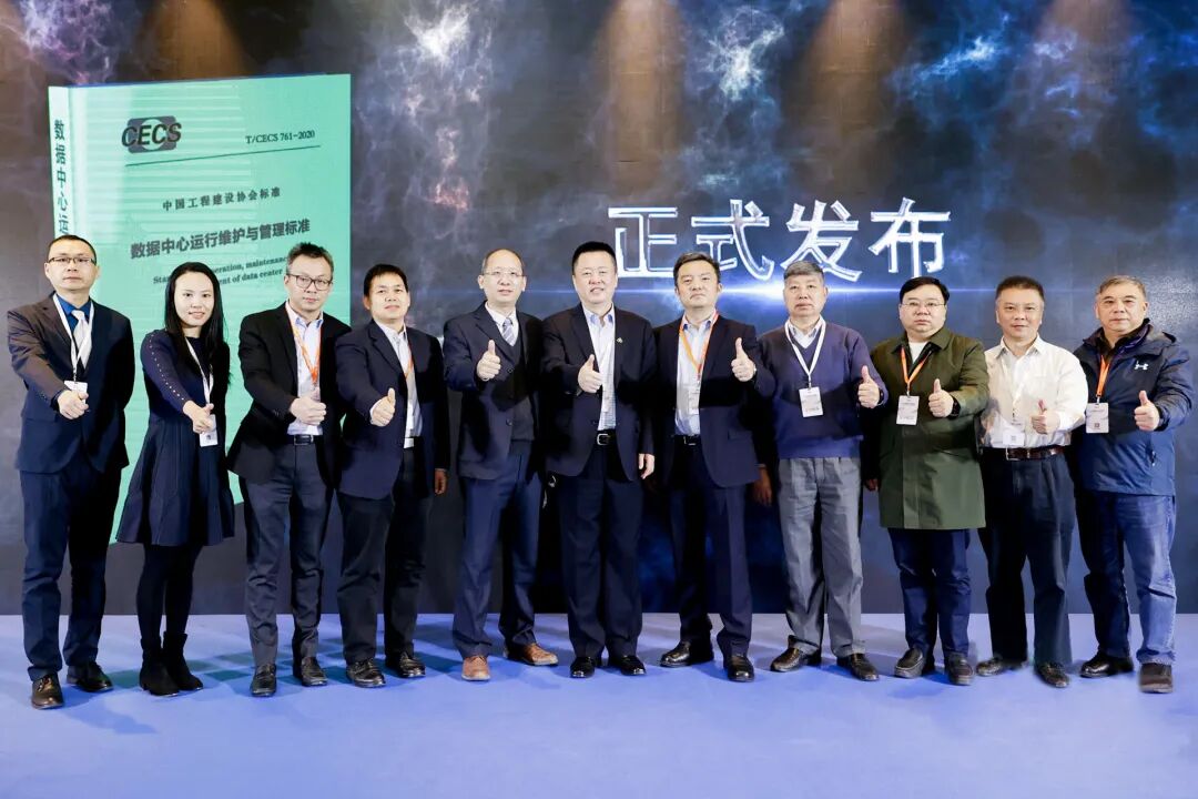 图:中国电子工程设计院副总工程师、CDCC组长钟景华(左六)、英维克副总裁王铁旺(左七)等参编人员共同出席《数据中心运行维护和管理标准》发布仪式